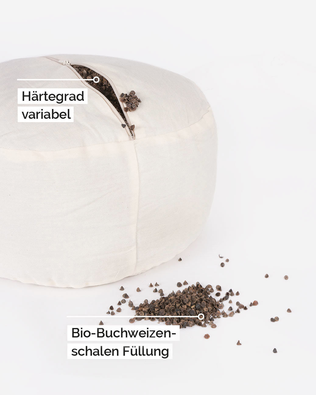 Unsere Yogakissen bestehen aus einem abnehmbaren Cord-Bezug (Oeko-Tex 100) und einem Inlett aus 100% Baumwolle, gefüllt mit Bio-Buchweizenschalen. Durch den Reißverschluss kannst du die Füllung einfach entnehmen oder nachfüllen, um den Härtegrad des Kissens individuell auf deine Bedürfnisse anzupassen. Die praktische Trageschlaufe am Yogakissen hilft dir das Kissen an deinen liebsten Ort zu transportieren, an dem du dich ungestört auf deine Yoga- und Meditationspraxis einlassen kannst.