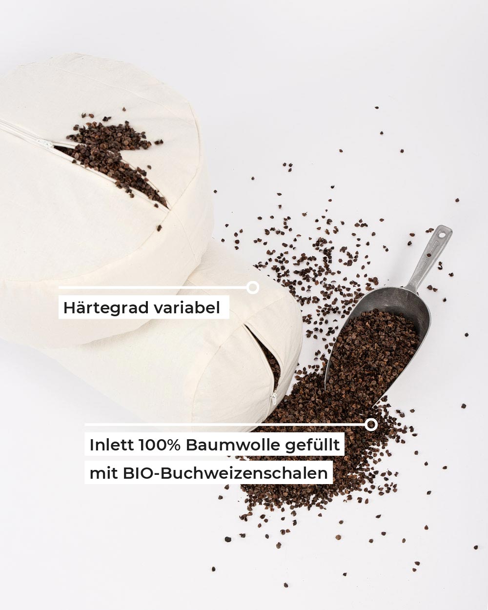 Unsere Yogakissen bestehen aus einem abnehmbaren Bezug und einem Inlett aus 100% Baumwolle, gefüllt mit Bio-Buchweizenschalen. Durch den Reißverschluss kannst du die Füllung einfach entnehmen oder nachfüllen, um den Härtegrad des Kissens individuell auf deine Bedürfnisse anzupassen. Die praktische Trageschlaufe am Yogakissen hilft dir das Kissen an deinen liebsten Ort zu transportieren, an dem du dich ungestört auf deine Yoga- und Meditationspraxis einlassen kannst.