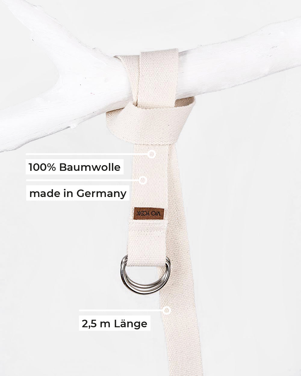 Der Gurt aus 100% reiner Baumwolle mit seinen stabilen Metallringen bietet dir sicheren Halt bei deinen Übungen. Der Yogagurt verschafft dir mehr Länge, um die Dehnung deiner Asanas zu vertiefen oder den Abstand zu überbrücken, wenn du in einigen Übungen noch nicht so flexibel bist. Der VIO YOGA® Gurt wird zu deiner Armverlängerung und hilft dir die Yogaübungen korrekt auszuführen. Die VIO YOGA® Gurte werden in Deutschland von Hand gefertigt!