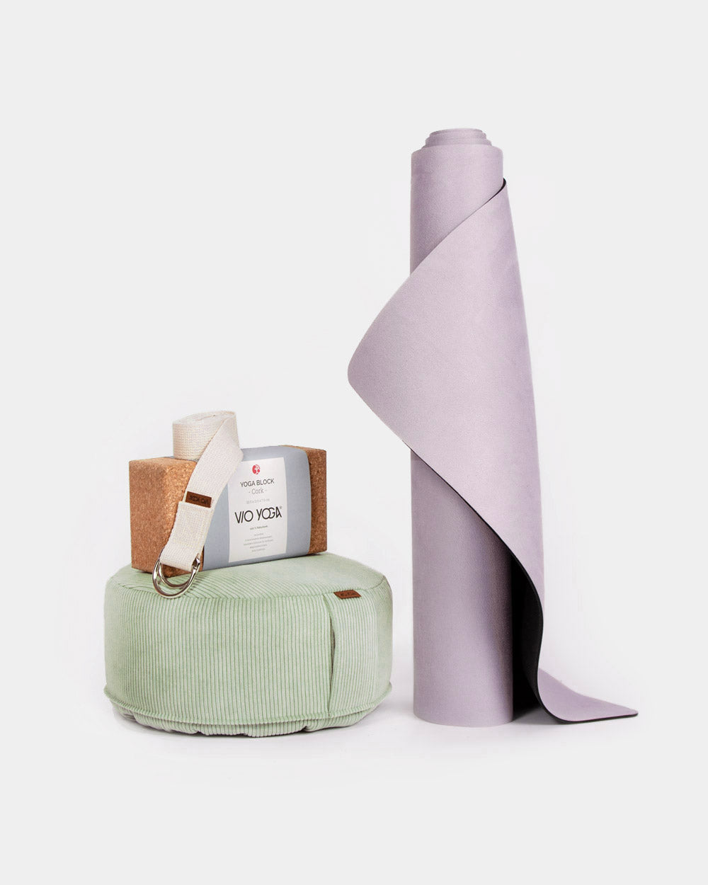 Yoga Set Velvet Rug Plus von VIO YOGA®: Dieses Set bietet alles was ein Yogi für die tägliche Praxis benötigt. Du bekommst einen lavender farbigen Velvet Rug, einen Yogablock aus Kork zusammen mit einem hellen Yogagurt und einem salbei farbigen Meditationskissen.